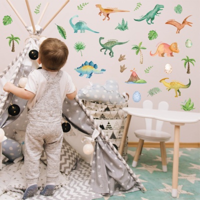 跨境恐龙墙贴森林卡通水彩橱窗衣柜家居幼儿园儿童房装饰PVC墙贴