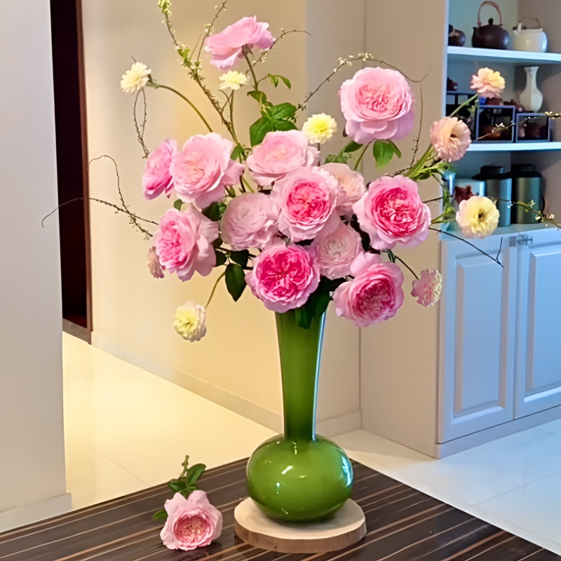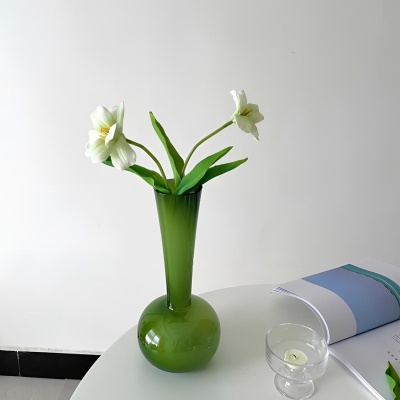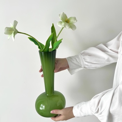 中式花瓶玻璃高级感橄榄绿客厅装饰摆件法式手工艺术蝴蝶兰插花瓶