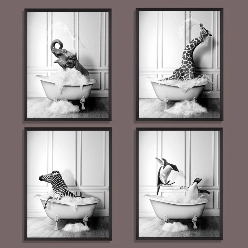 动物黑白艺术画大象斑马企鹅长颈鹿浴室帆布画海报家居装饰画芯