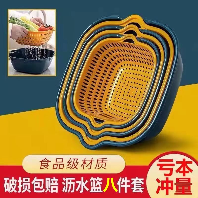 沥水篮六件套双层洗菜盆家用厨房洗菜框洗水果蓝塑料菜篮厂家直销