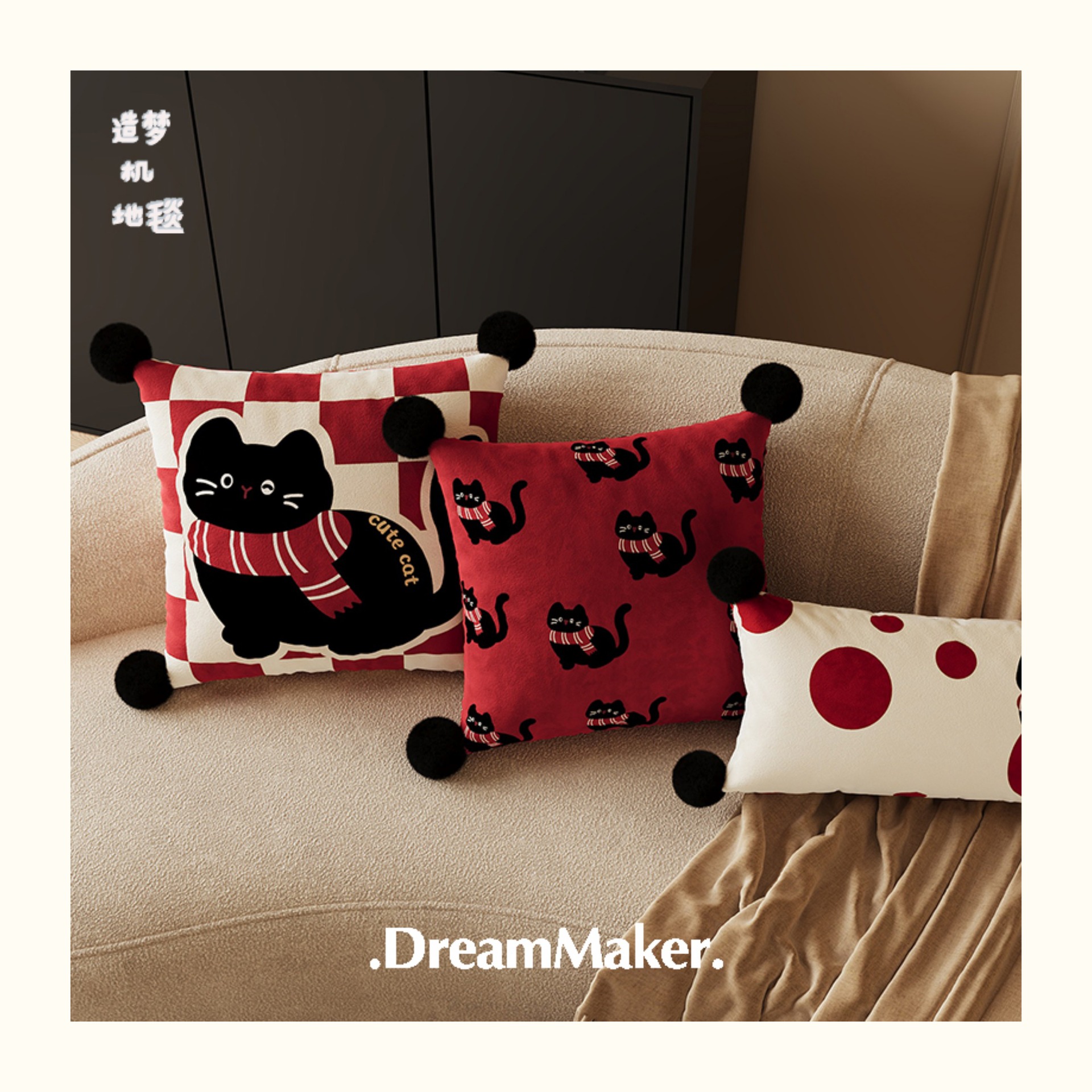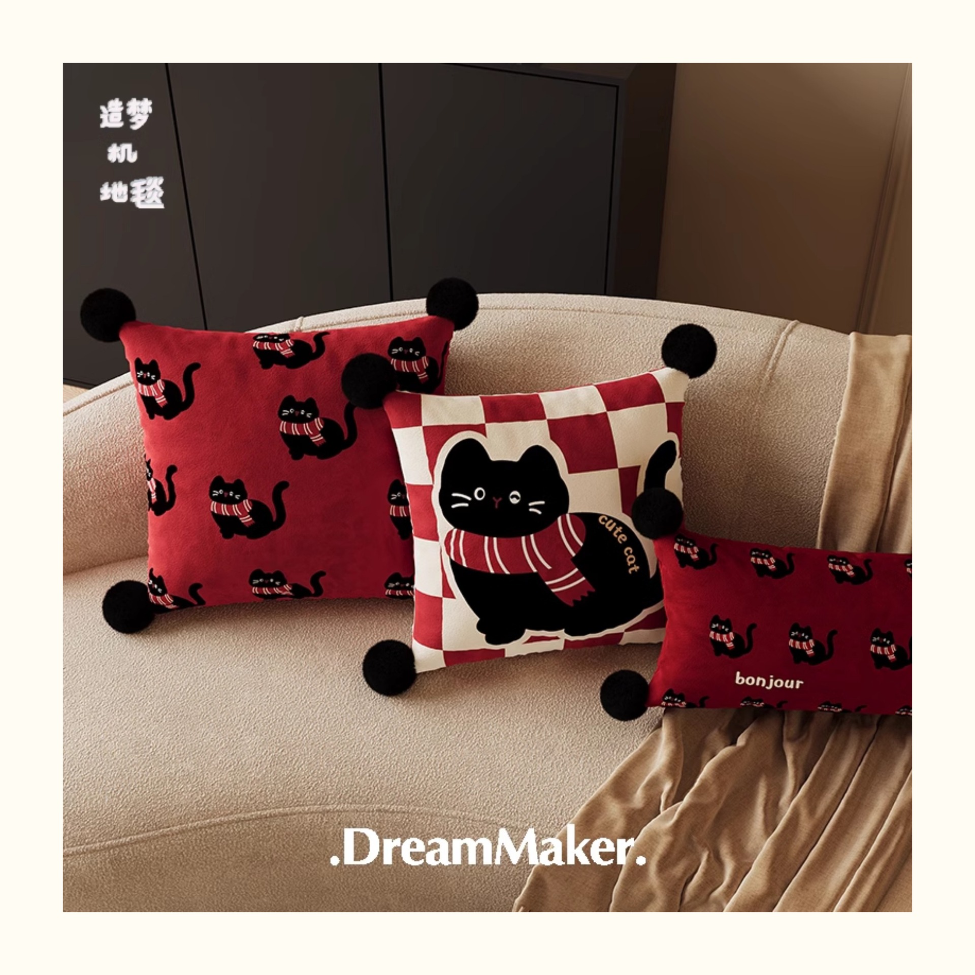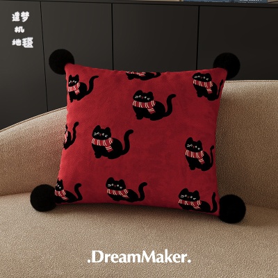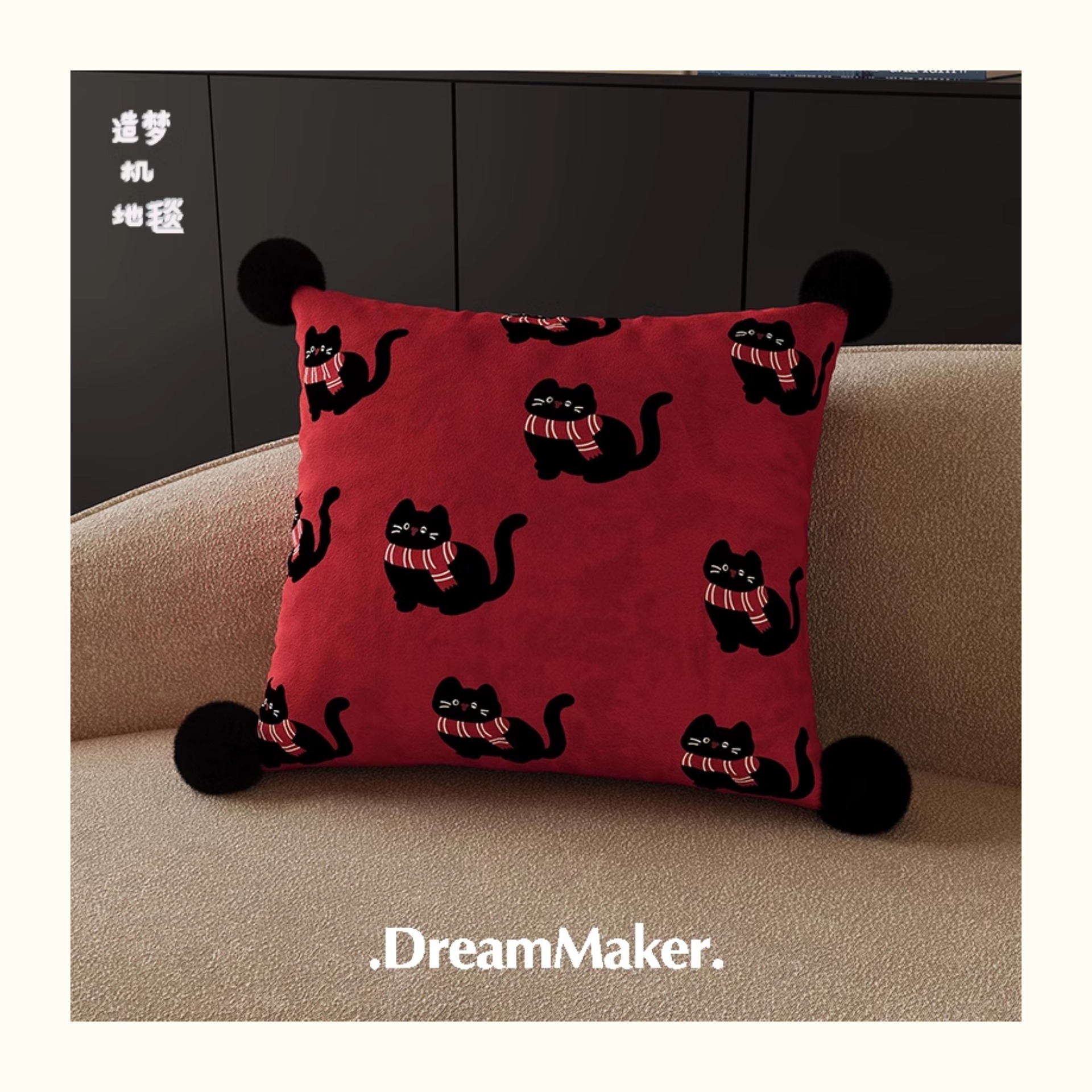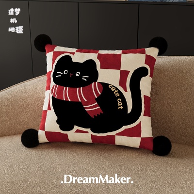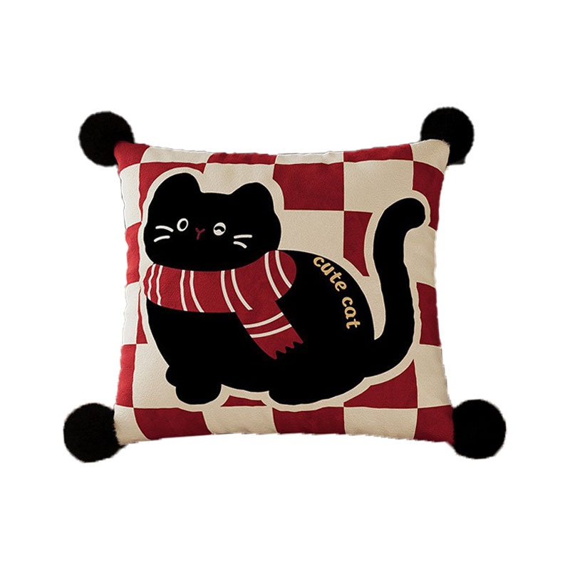商品名稱:2025红色新年小猫抱枕加厚荷兰绒方形可拆卸枕套卡通印花靠枕批发