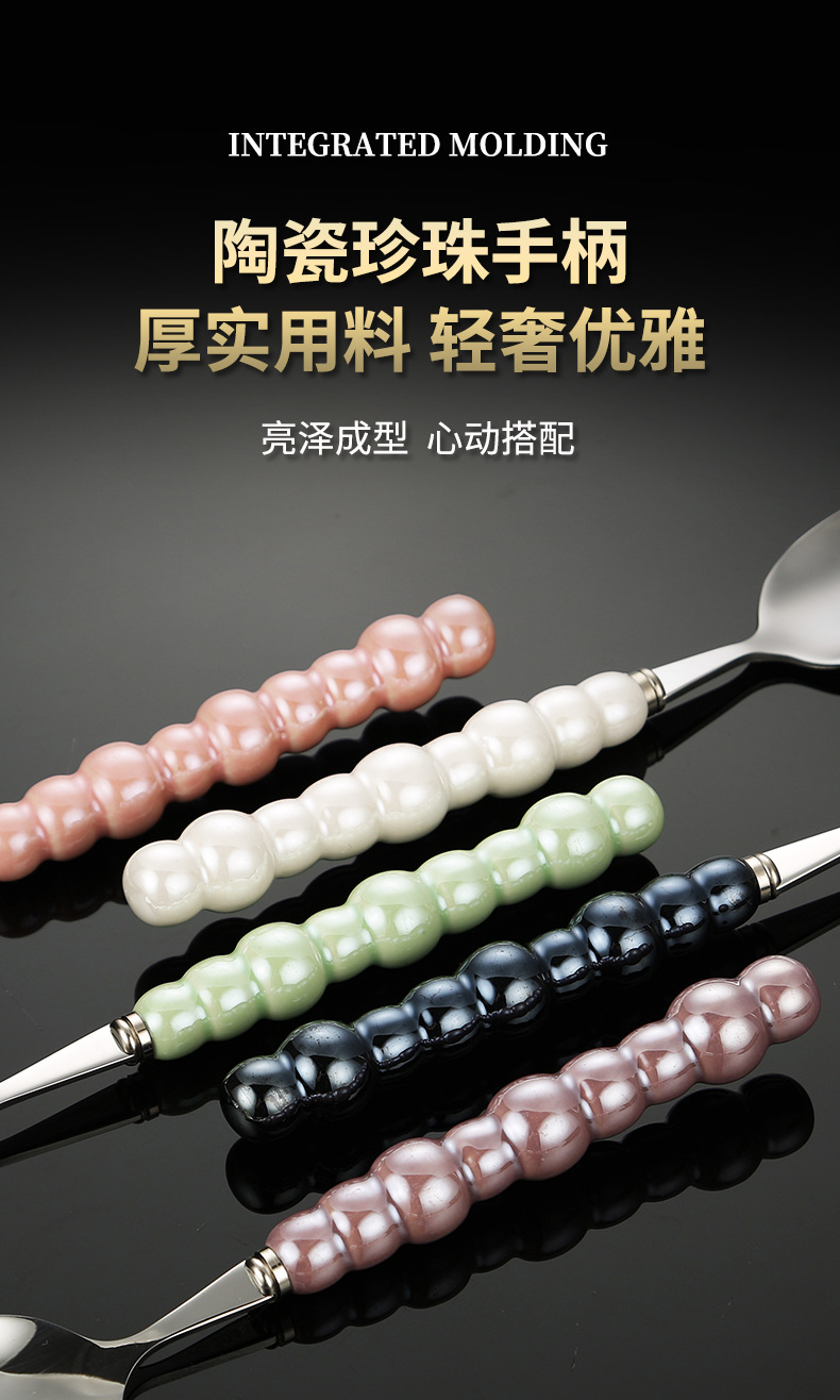 商品名稱:高颜值陶瓷柄304不锈钢牛排刀叉勺可爱珍珠釉勺子叉子创意甜品勺