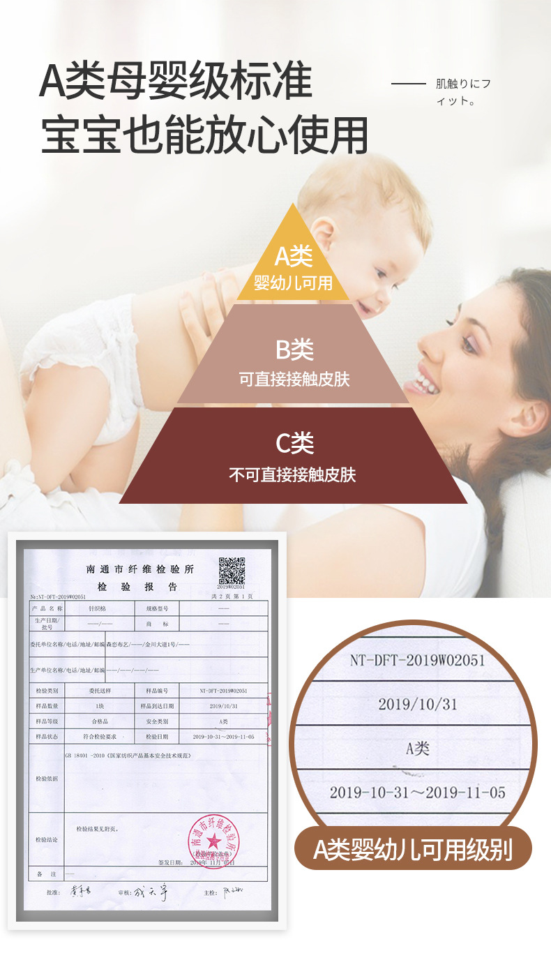 “A类母婴级100%原棉本色、无漂染、无荧光、无甲醛”