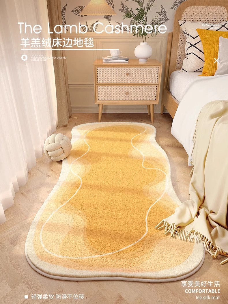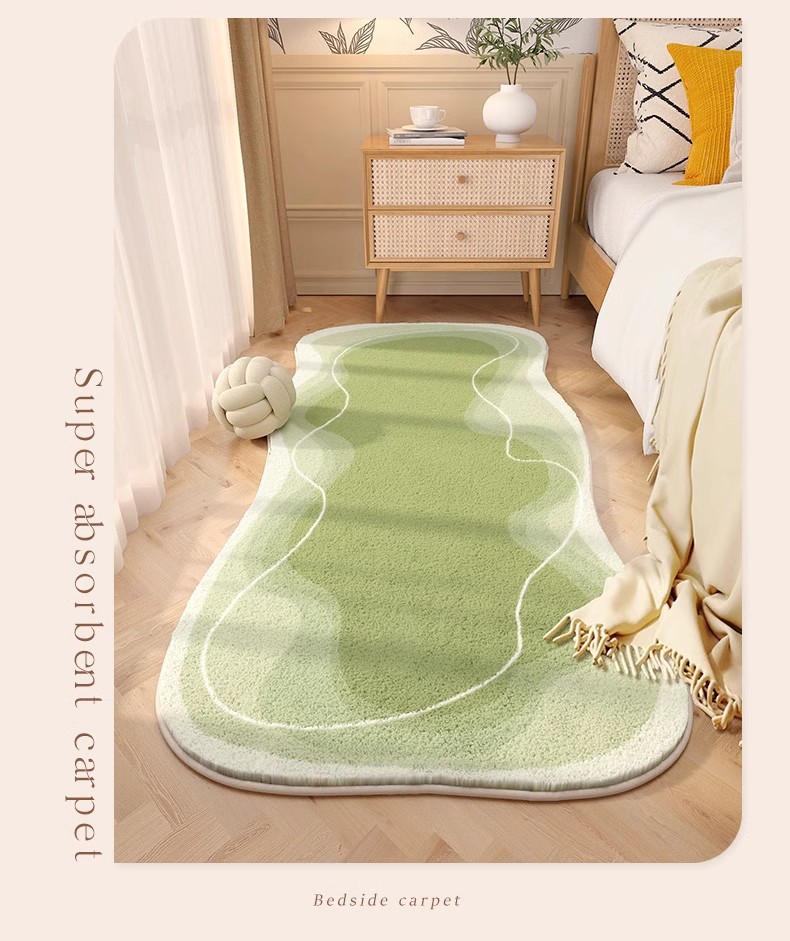 新款卧室绿色床边地毯少女ins奶油风轻奢高级感不规则长条地垫