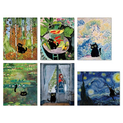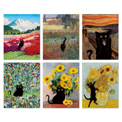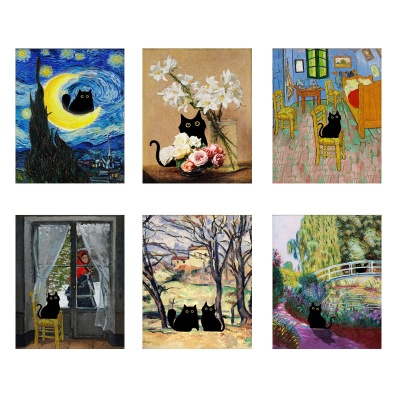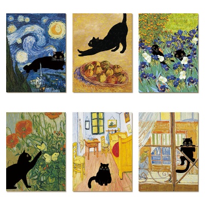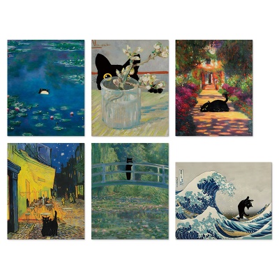 外贸新款莫奈梵高装饰画帆布画芯世界名画创意猫咪海报卧室挂画