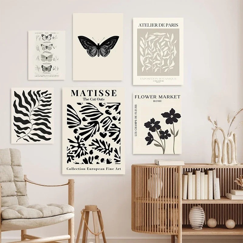 商品名稱:复古黑色蝴蝶花卉抽象马蒂斯客厅卧室帆布画海报墙艺术画芯无框画