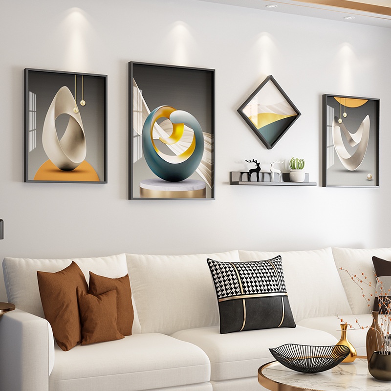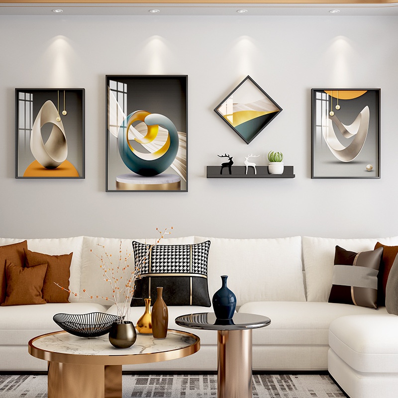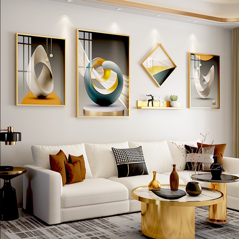 新中式客厅4框晶瓷光影几何铝合金装饰画置物架组合金属画框