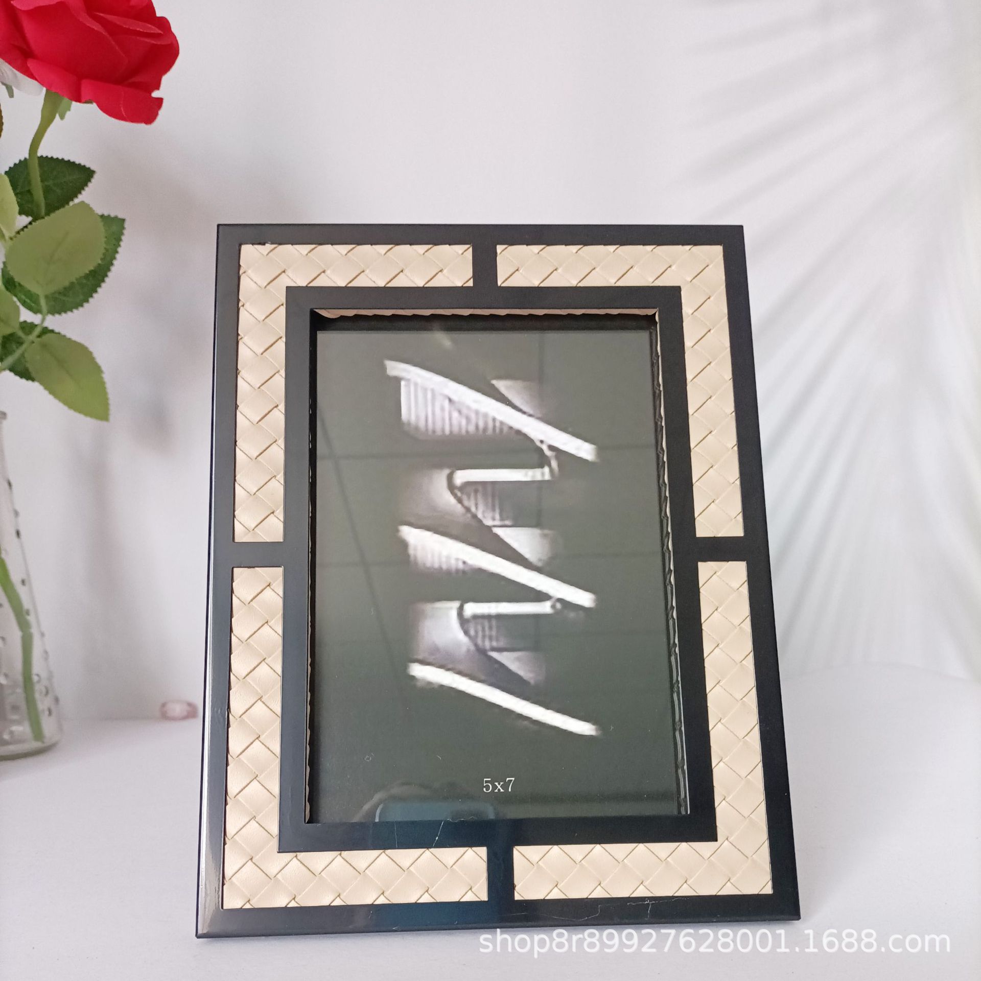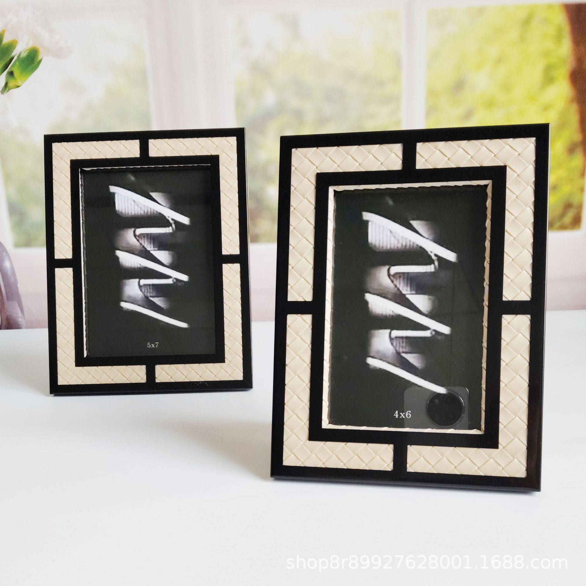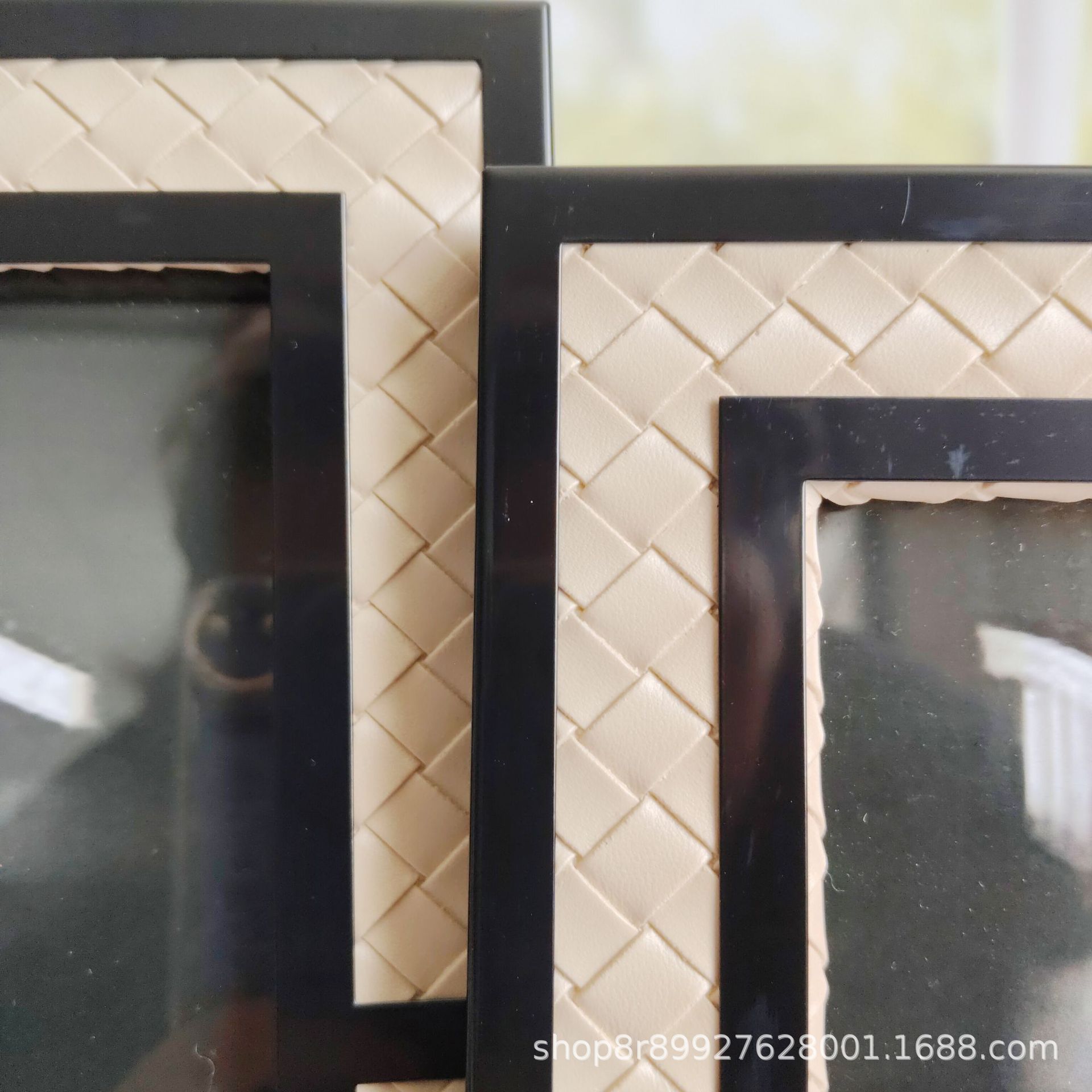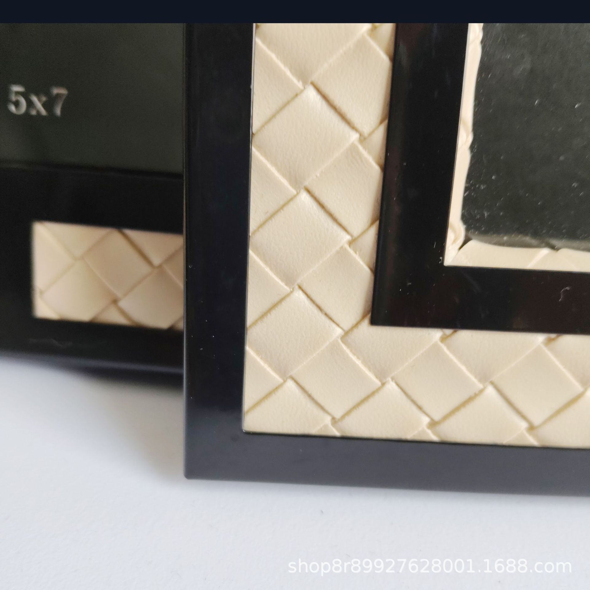 黑色铁框镶嵌现代简约编织纹皮革相框 样板房软装皮革相框摆台摆