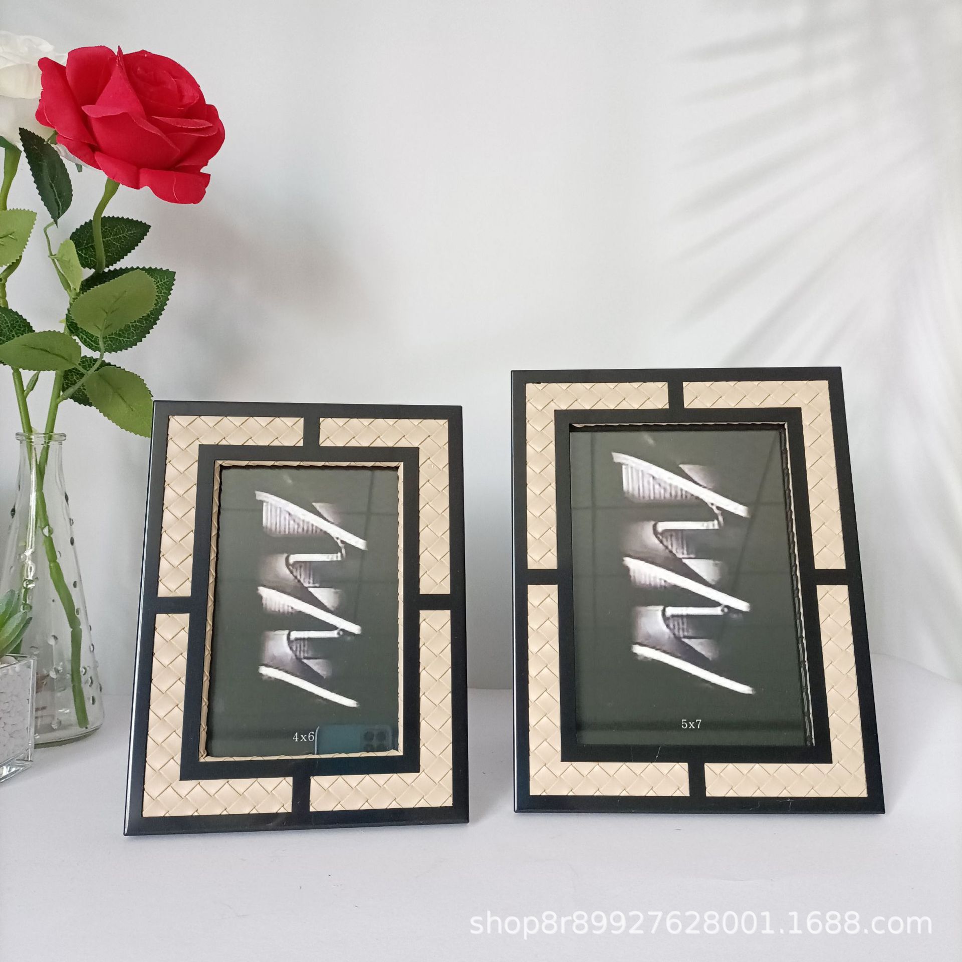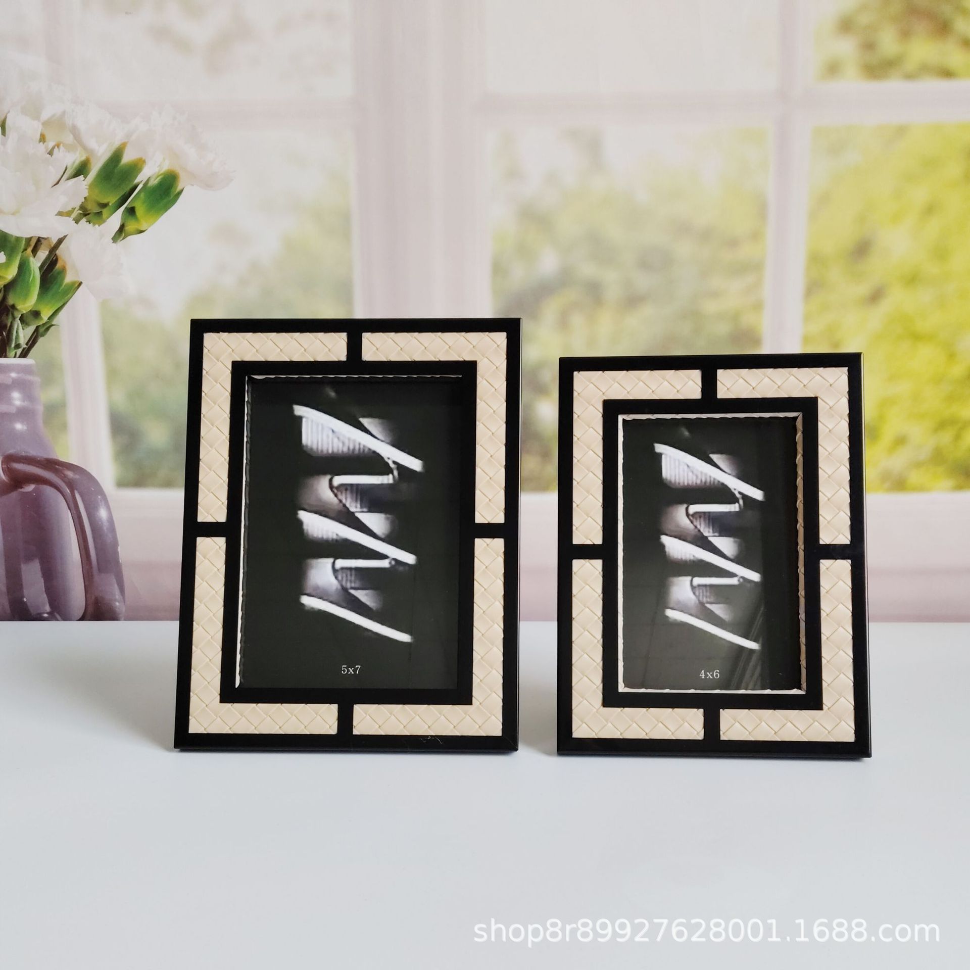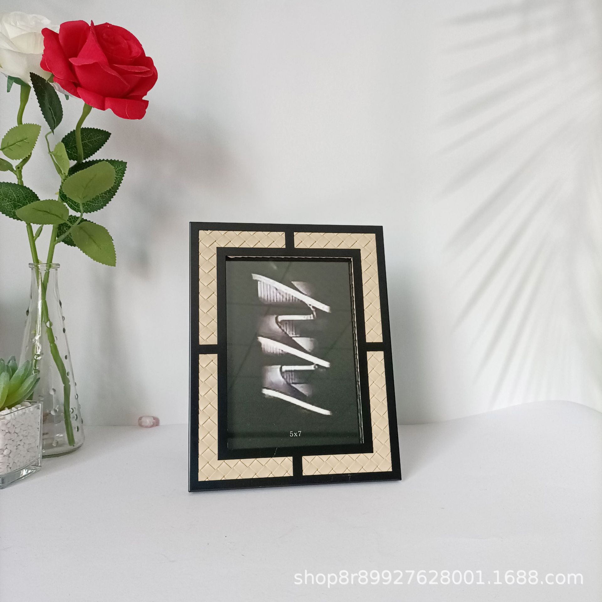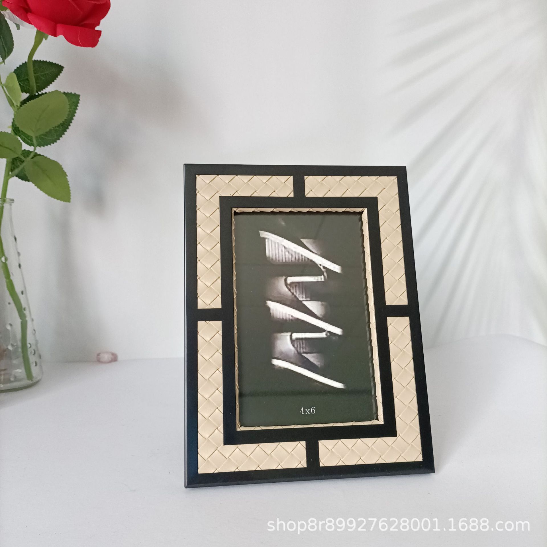 黑色铁框镶嵌现代简约编织纹皮革相框 样板房软装皮革相框摆台摆