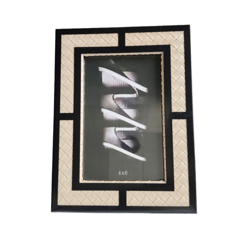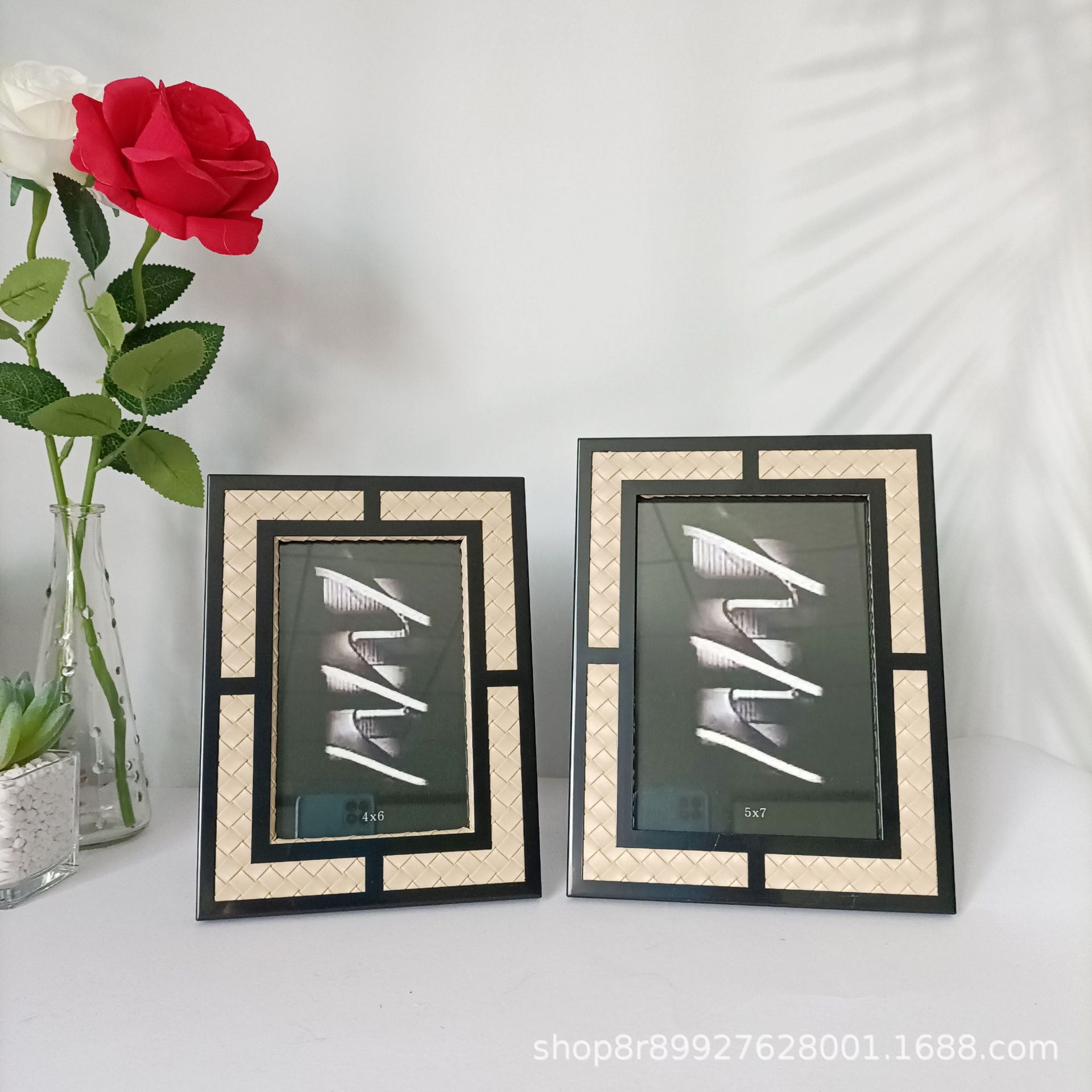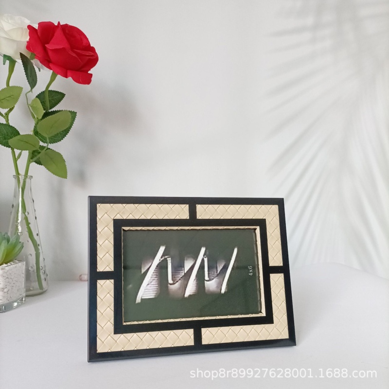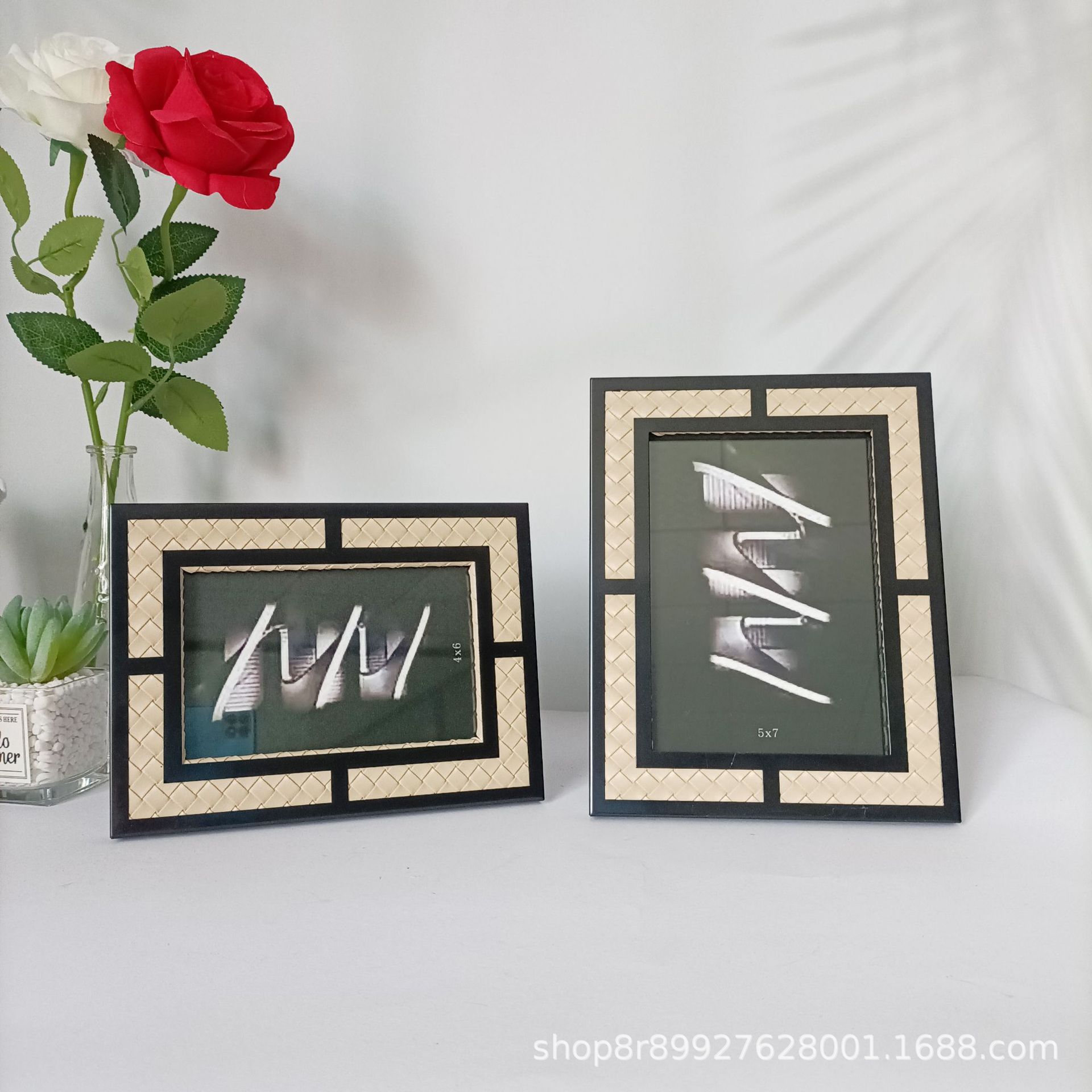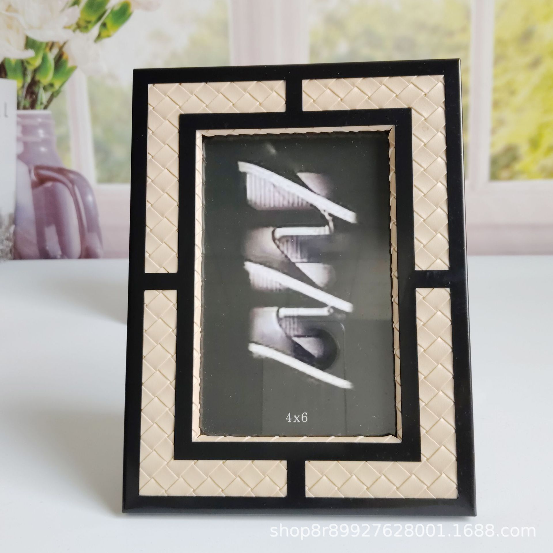 黑色铁框镶嵌现代简约编织纹皮革相框 样板房软装皮革相框摆台摆