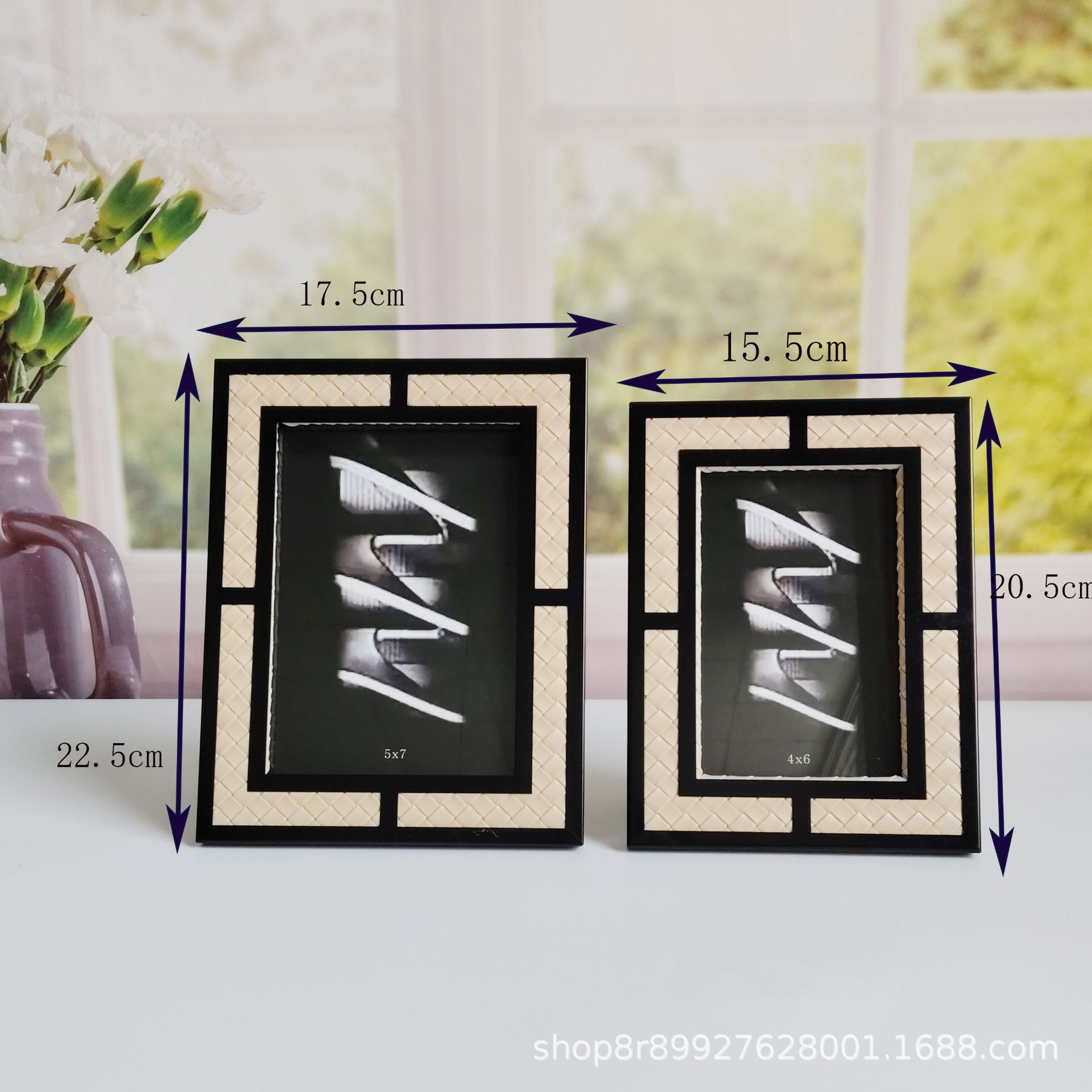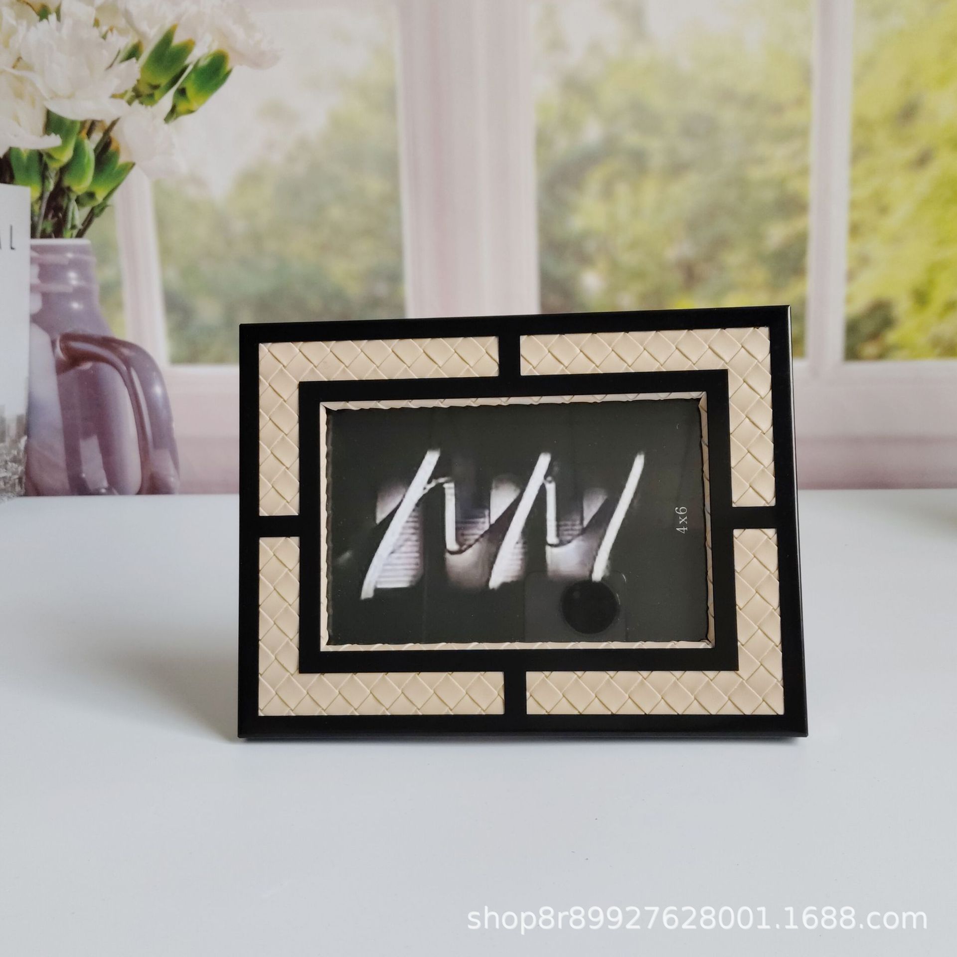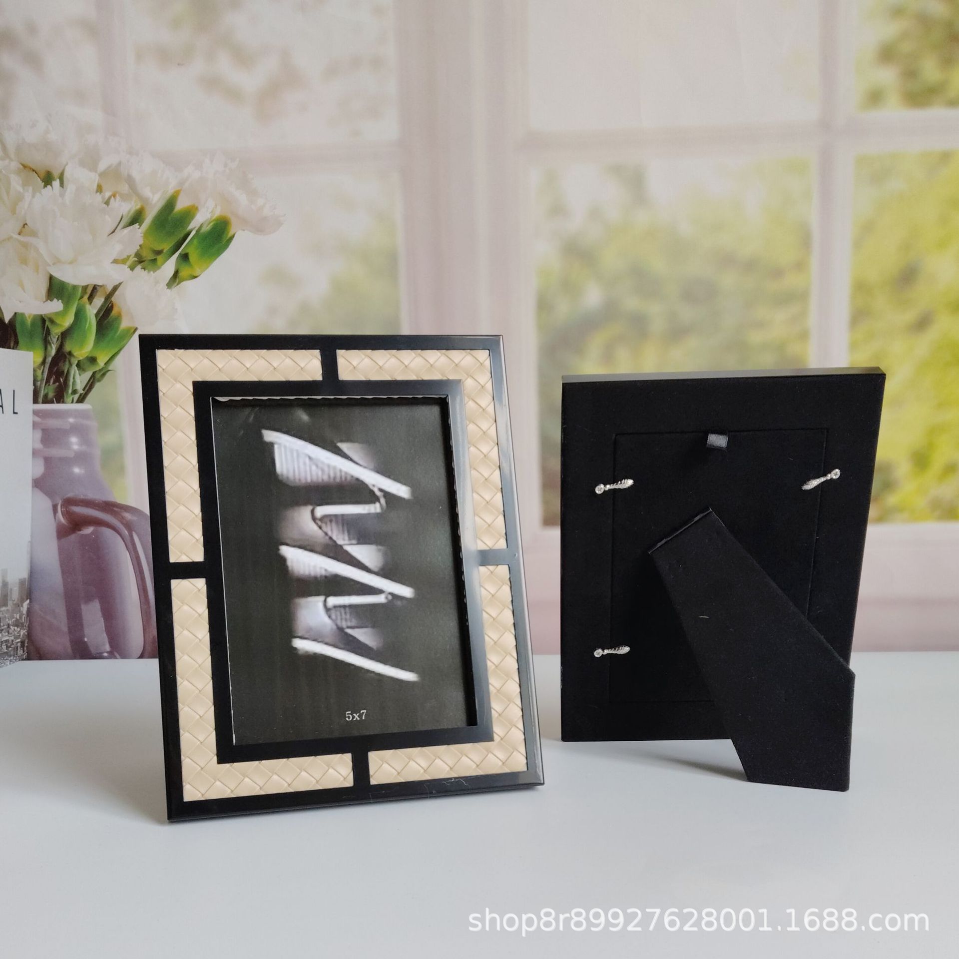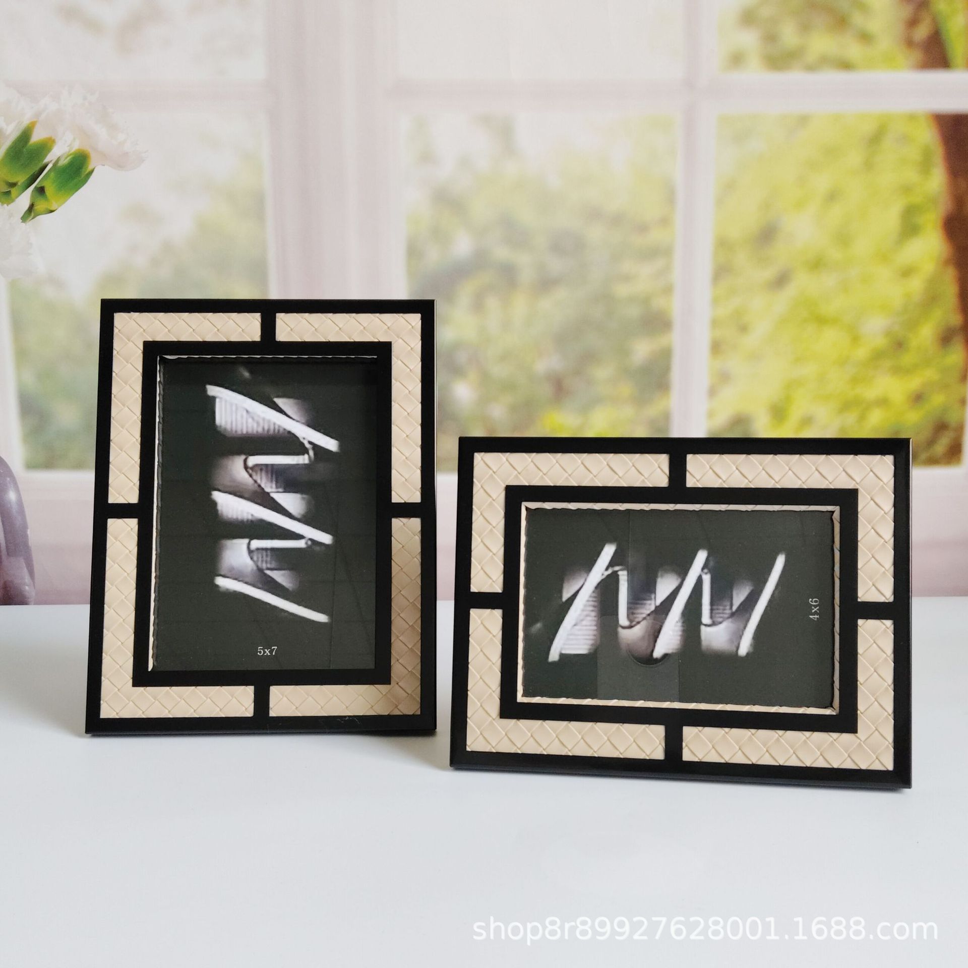 商品名稱:黑色铁框镶嵌现代简约编织纹皮革相框 样板房软装皮革相框摆台摆