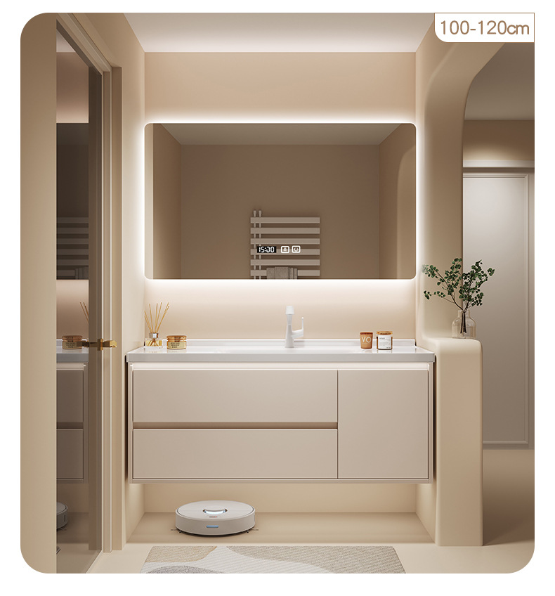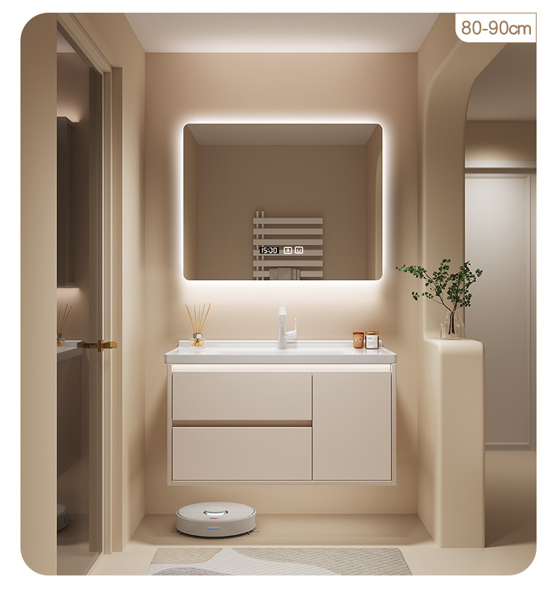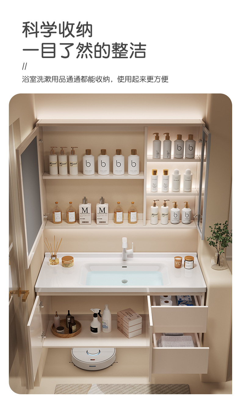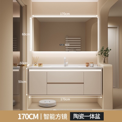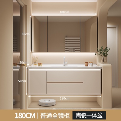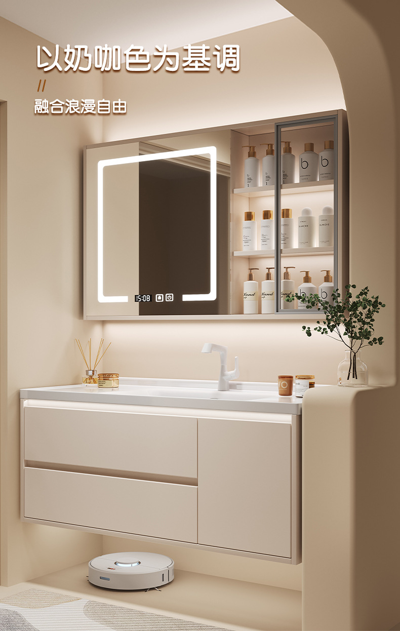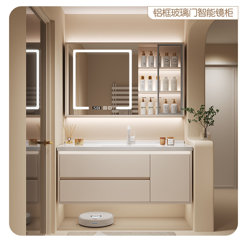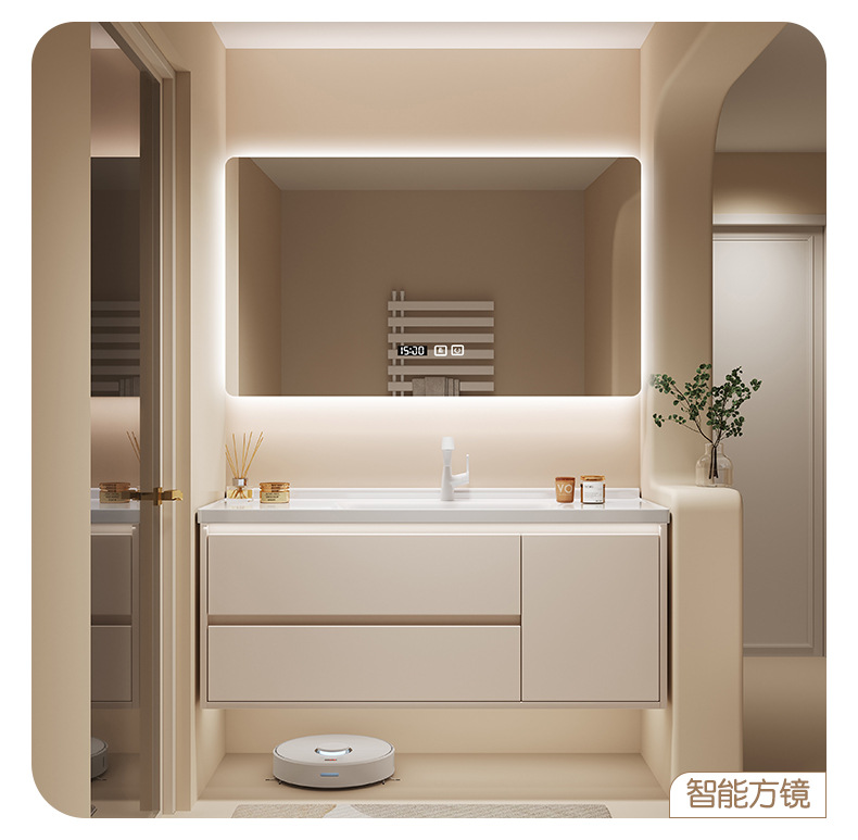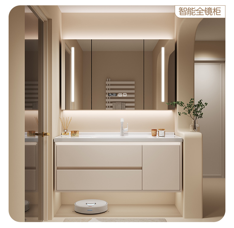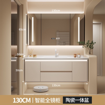 浴室柜组合卫生间洗手台洗脸盆柜洗漱台陶瓷一体盆智能镜柜奶油风