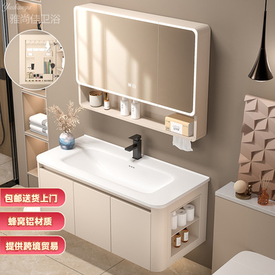 奶油风加厚蜂窝铝圆角浴室柜洗手盆柜组合卫生间洗漱台陶瓷一体盆