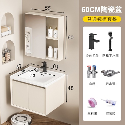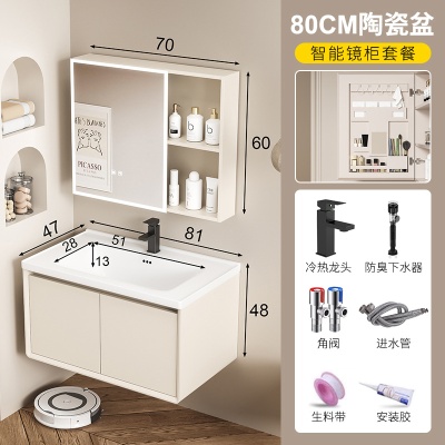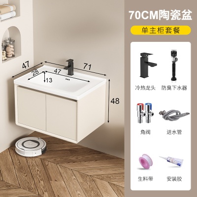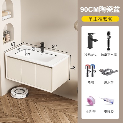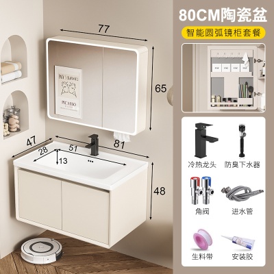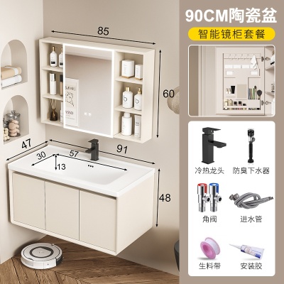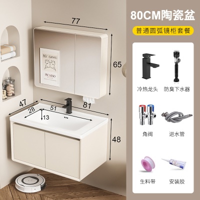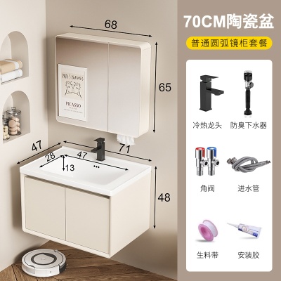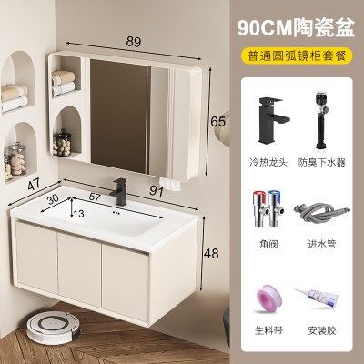 商品名稱:奶油风加厚蜂窝铝圆角浴室柜洗手盆柜组合卫生间洗漱台陶瓷一体盆