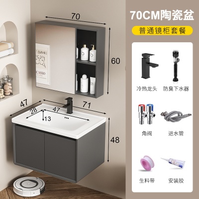 深灰色70CM+陶瓷盆+普通圆弧镜柜