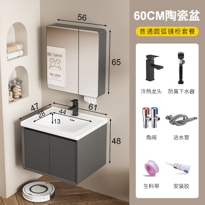 深灰色60CM+陶瓷盆+普通圆弧镜柜