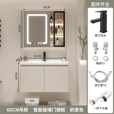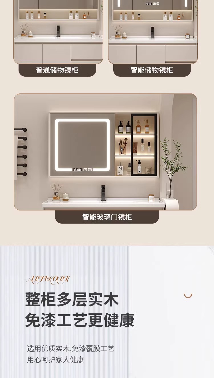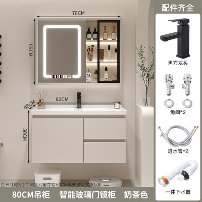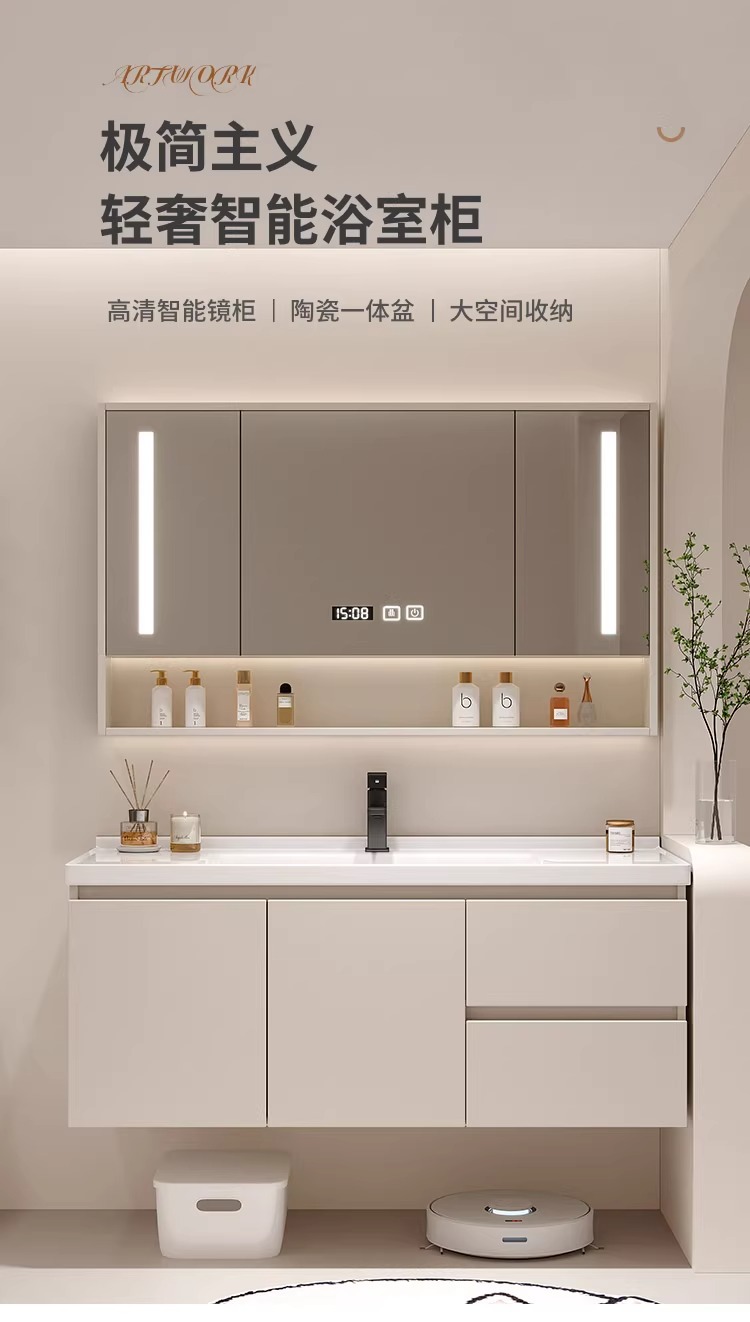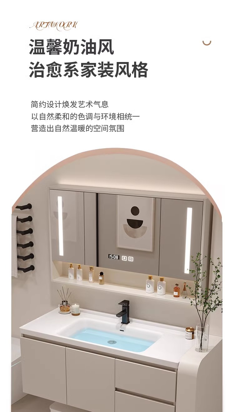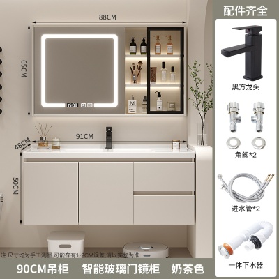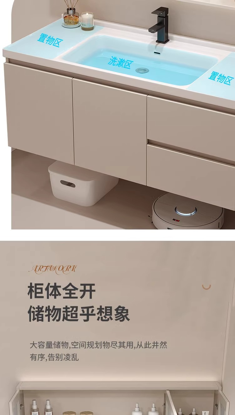 浴室柜组合卫生间洗手台洗脸盆柜洗漱台陶瓷一体盆智能镜柜奶油风