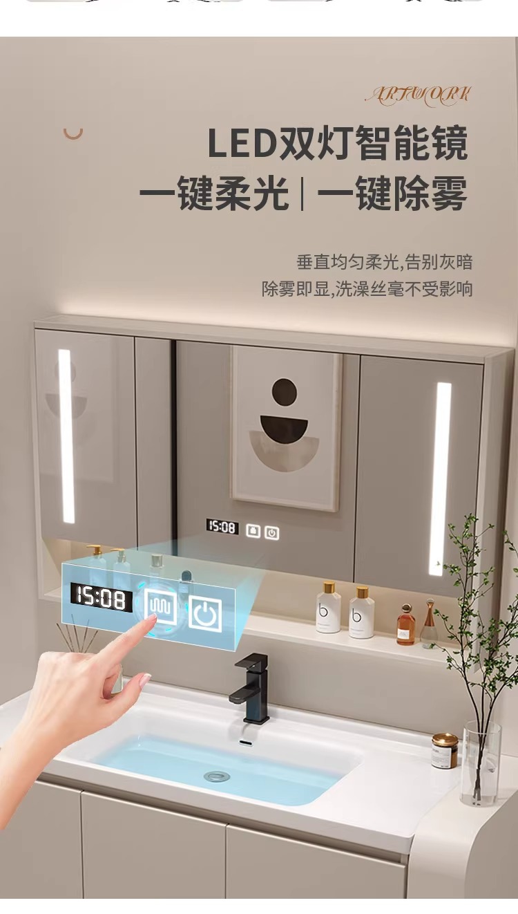 8038奶油风吊柜智能镜柜 送黑四方龙头