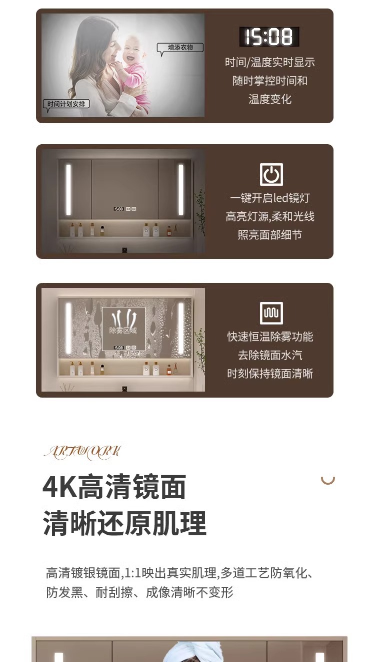 8038奶油风吊柜智能玻璃门镜柜 送黑四方龙头
