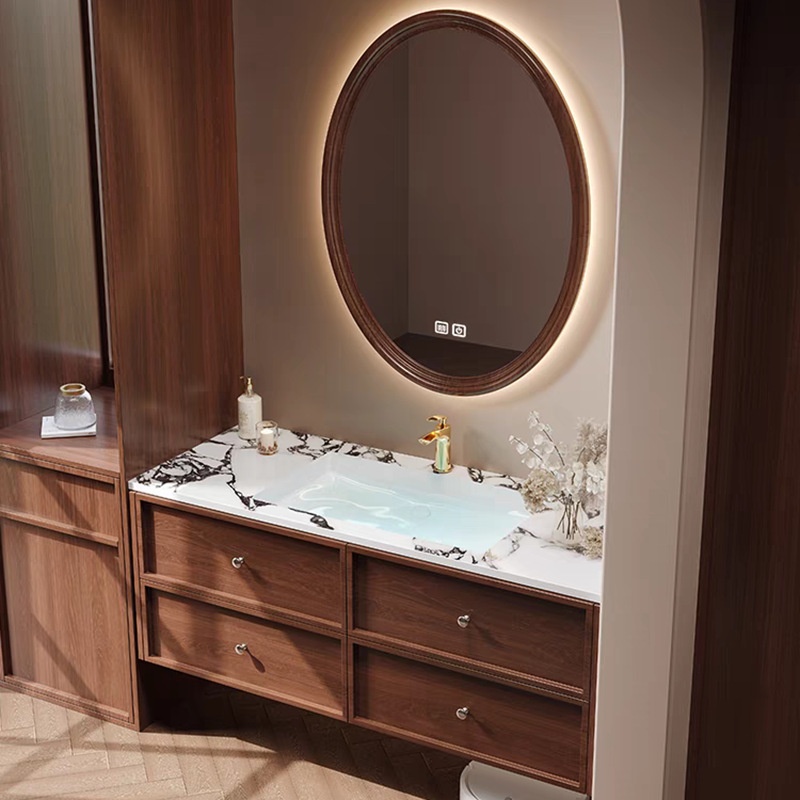 新中式中古风浴室柜组合橡木洗手洗脸盆洗漱台岩板热弯陶瓷一体盆