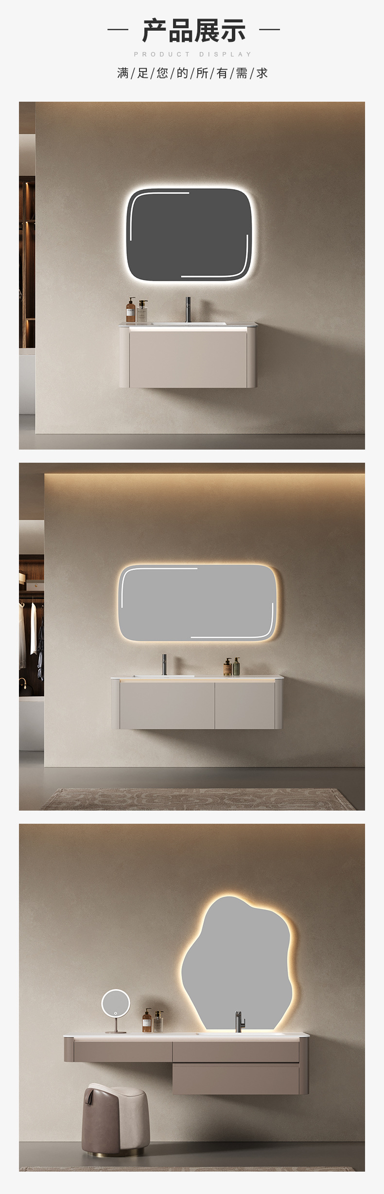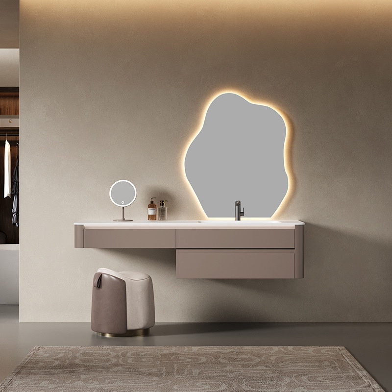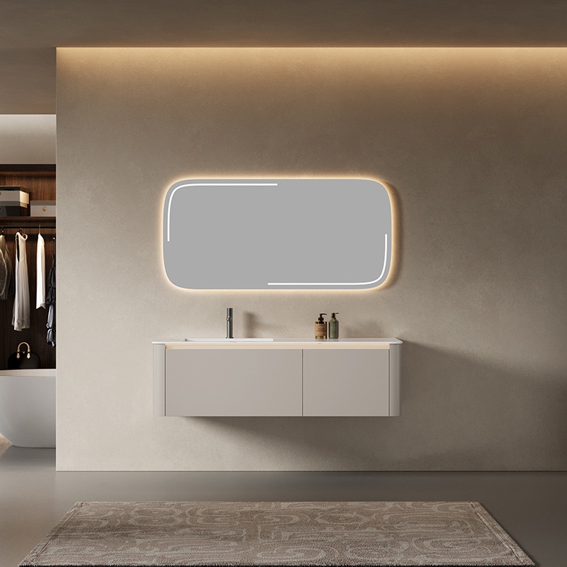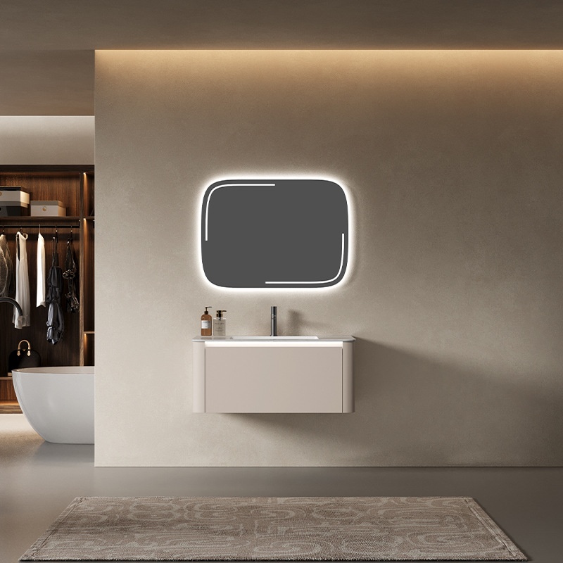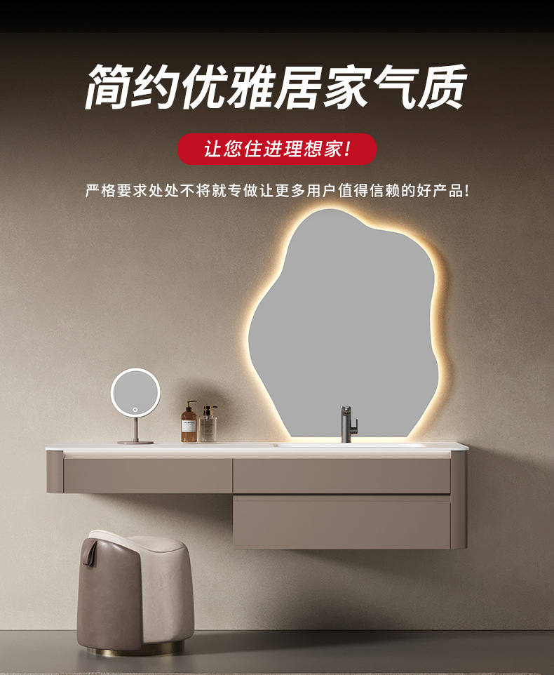 轻奢奶油风岩板浴室柜陶瓷一体盆带LED灯镜柜组合卫生间洗漱台
