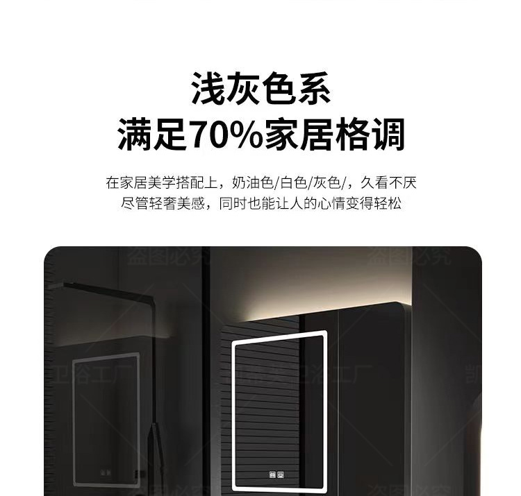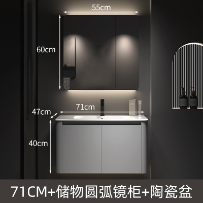 灰色圆角70CM陶瓷一体盆+圆弧智能镜柜