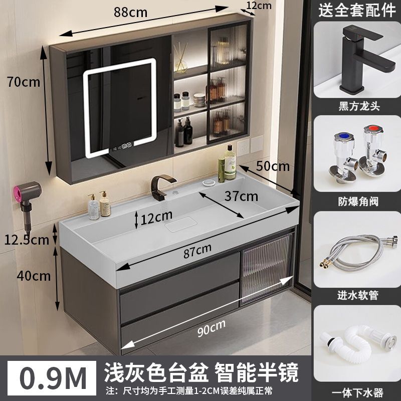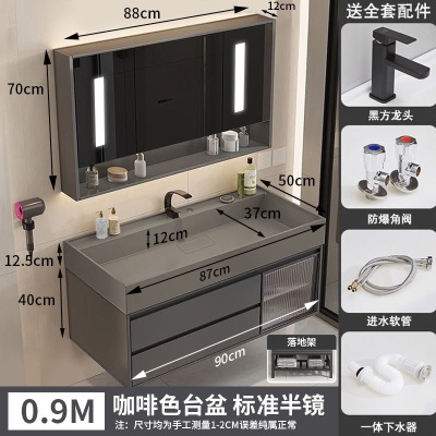 咖啡色-隐藏下水器【吊柜】-0.9米轻奢镜柜+质保(全新龙头)