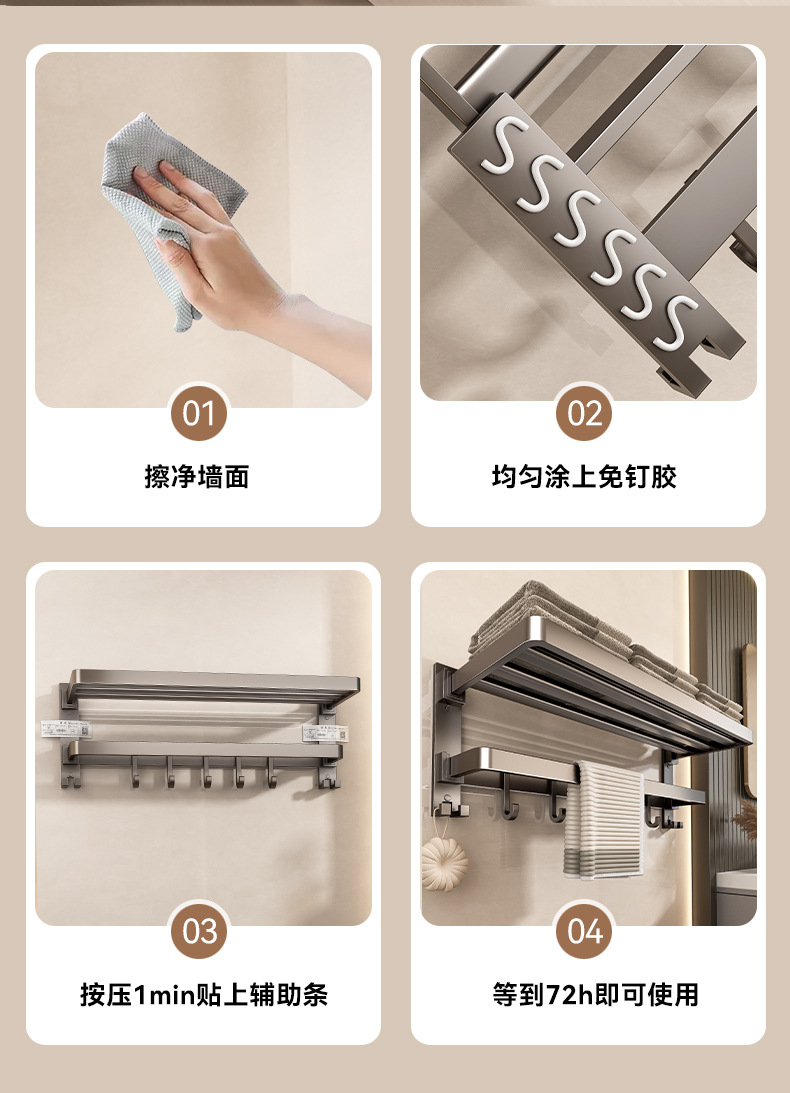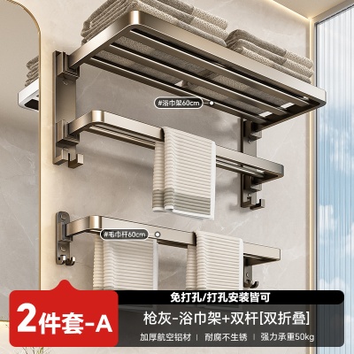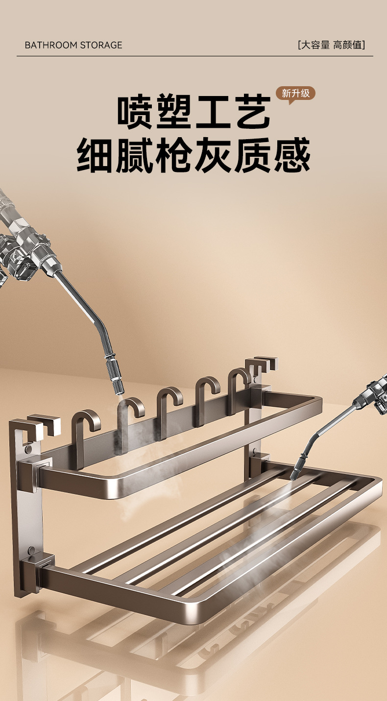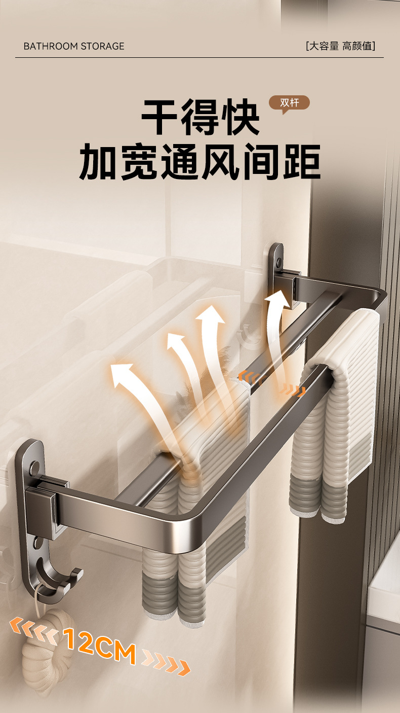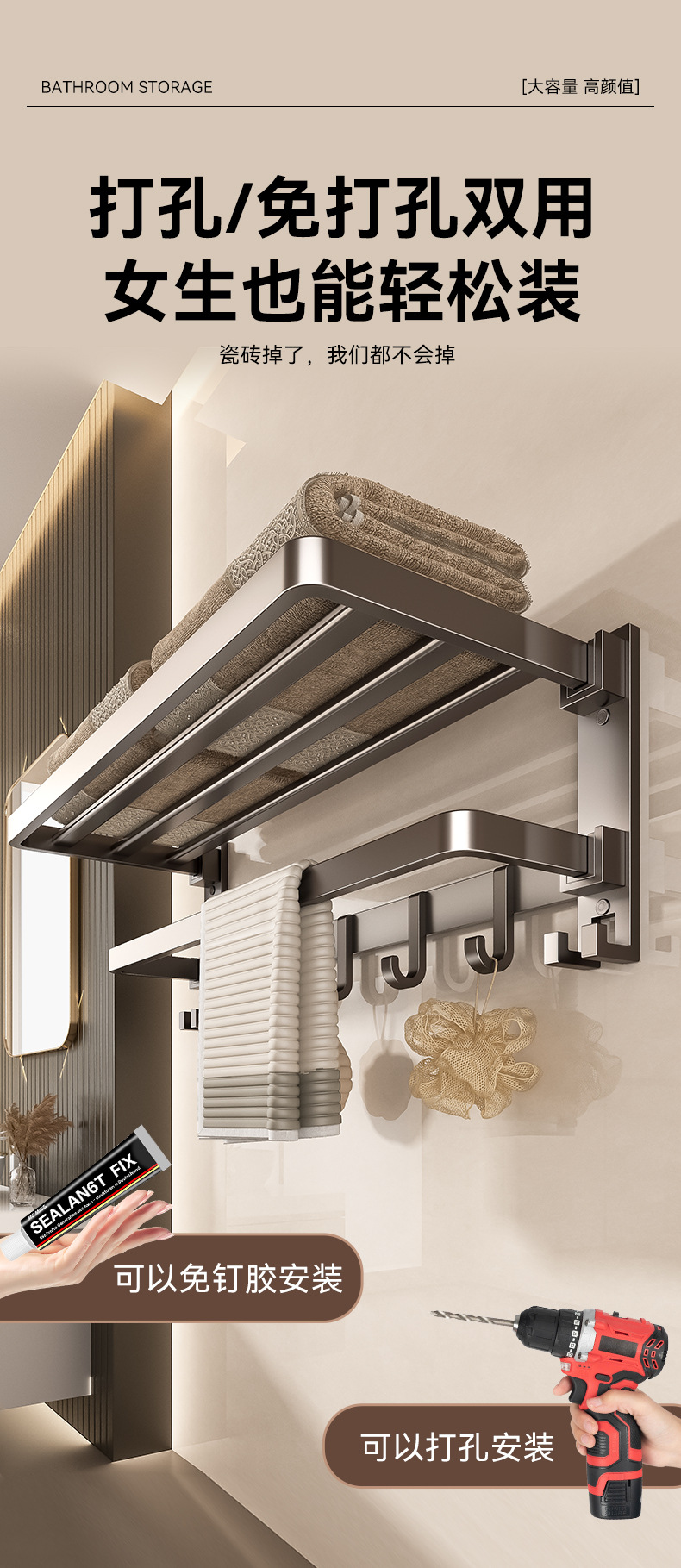 百悍毛巾架卫生间免打孔毛巾挂杆浴室厕所浴巾架毛巾一体置物架