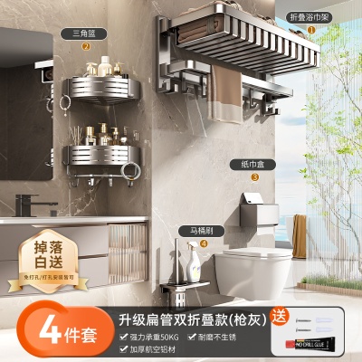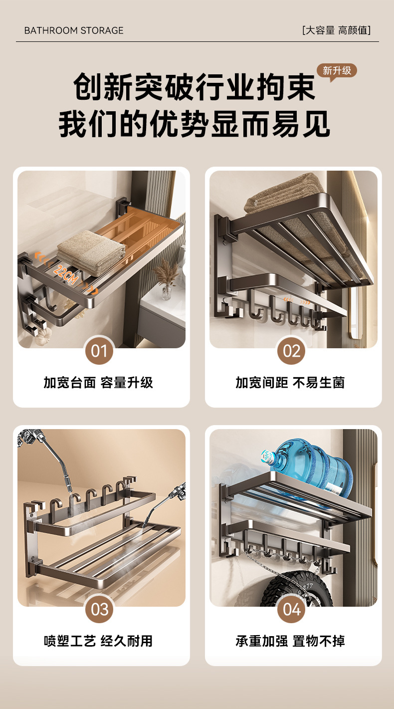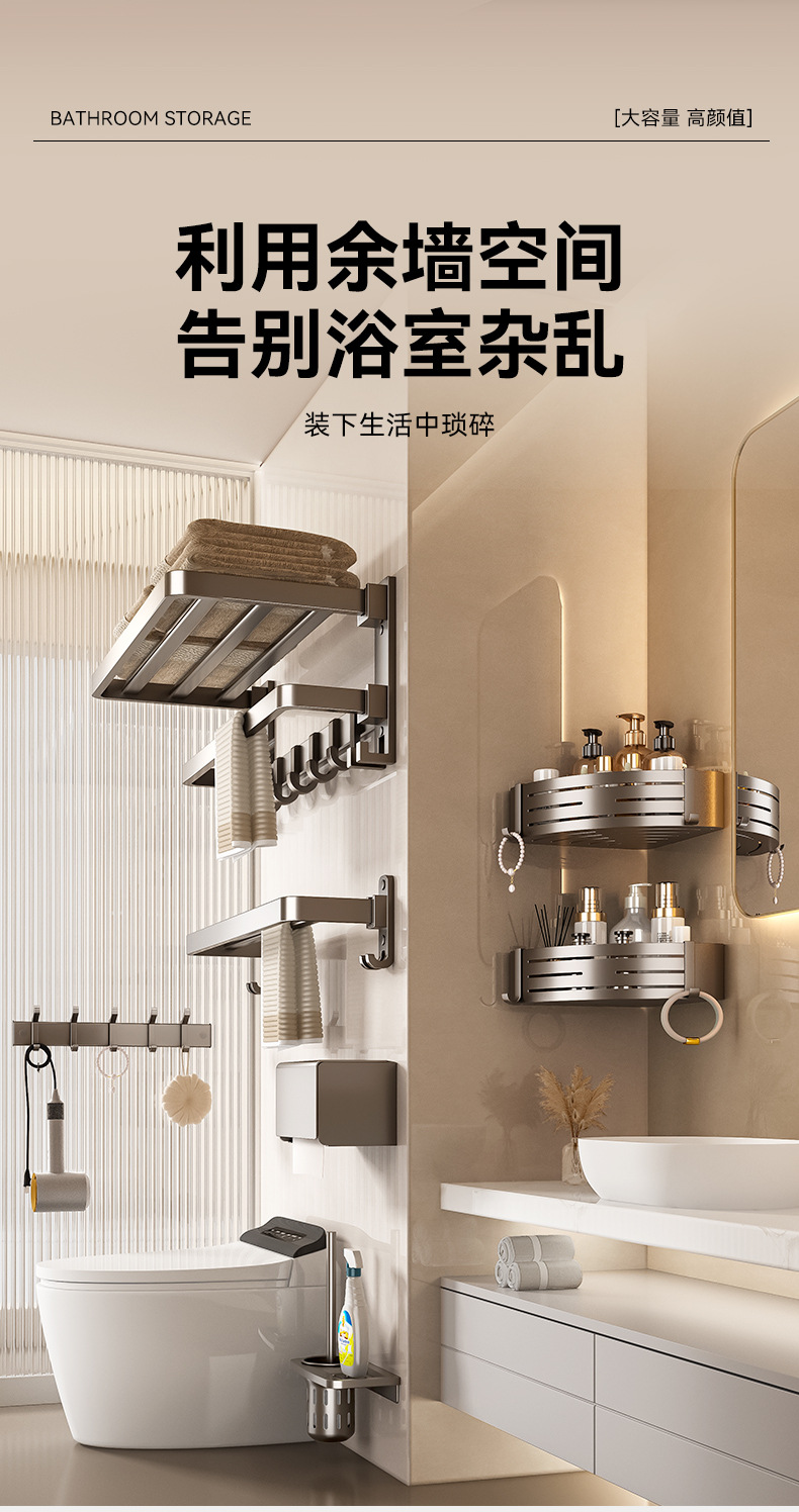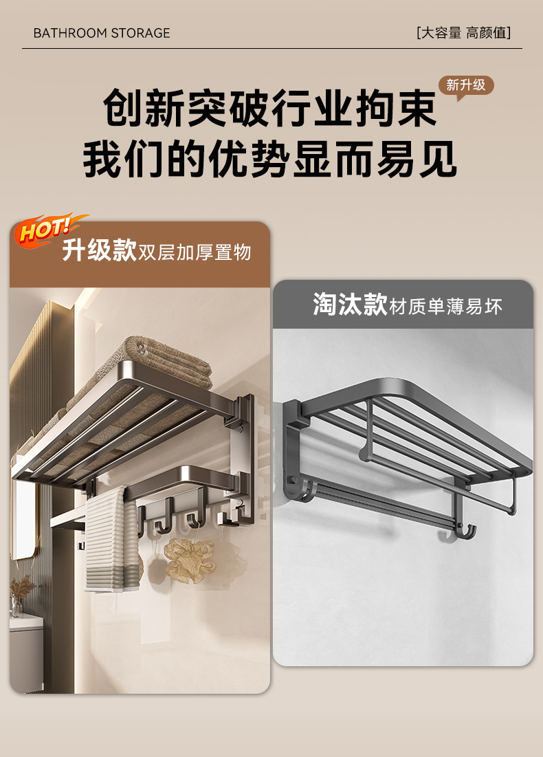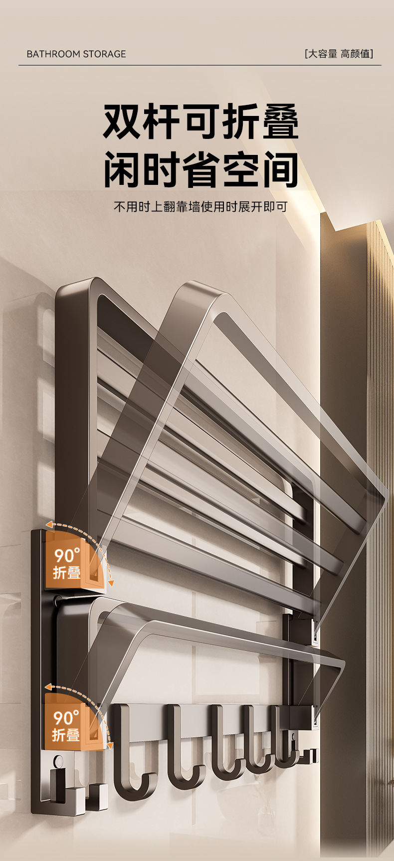 百悍毛巾架卫生间免打孔毛巾挂杆浴室厕所浴巾架毛巾一体置物架