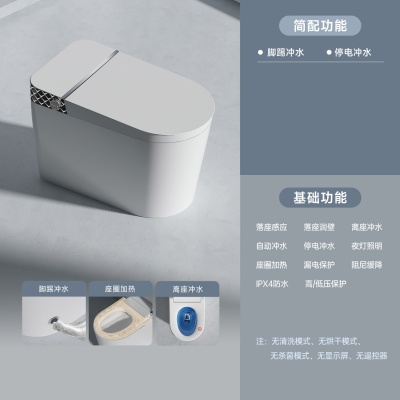 遥控,烘干,即热型,自动翻盖,臀部洗净,女性洗净,喷嘴自洁,喷嘴移动清洗,调节水压,加热水温,调节暖风,无水压限制