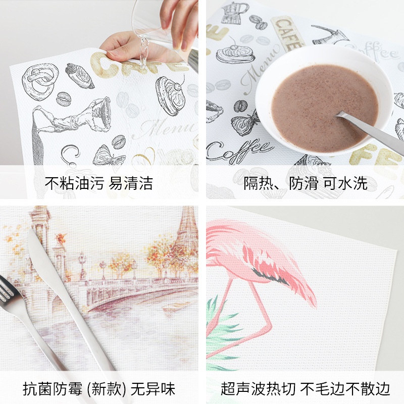 尺寸30*45cm 重量78g 默认包装10片OPP袋装 装箱数300片/箱 箱规48*33*30cm 毛重24.5KG宁欣圣诞餐垫PVC桌垫隔热垫防水防滑节日婚庆装饰家居酒店西餐垫UV印刷定制创意餐垫家居日用隔热防滑方形30*45cm78g